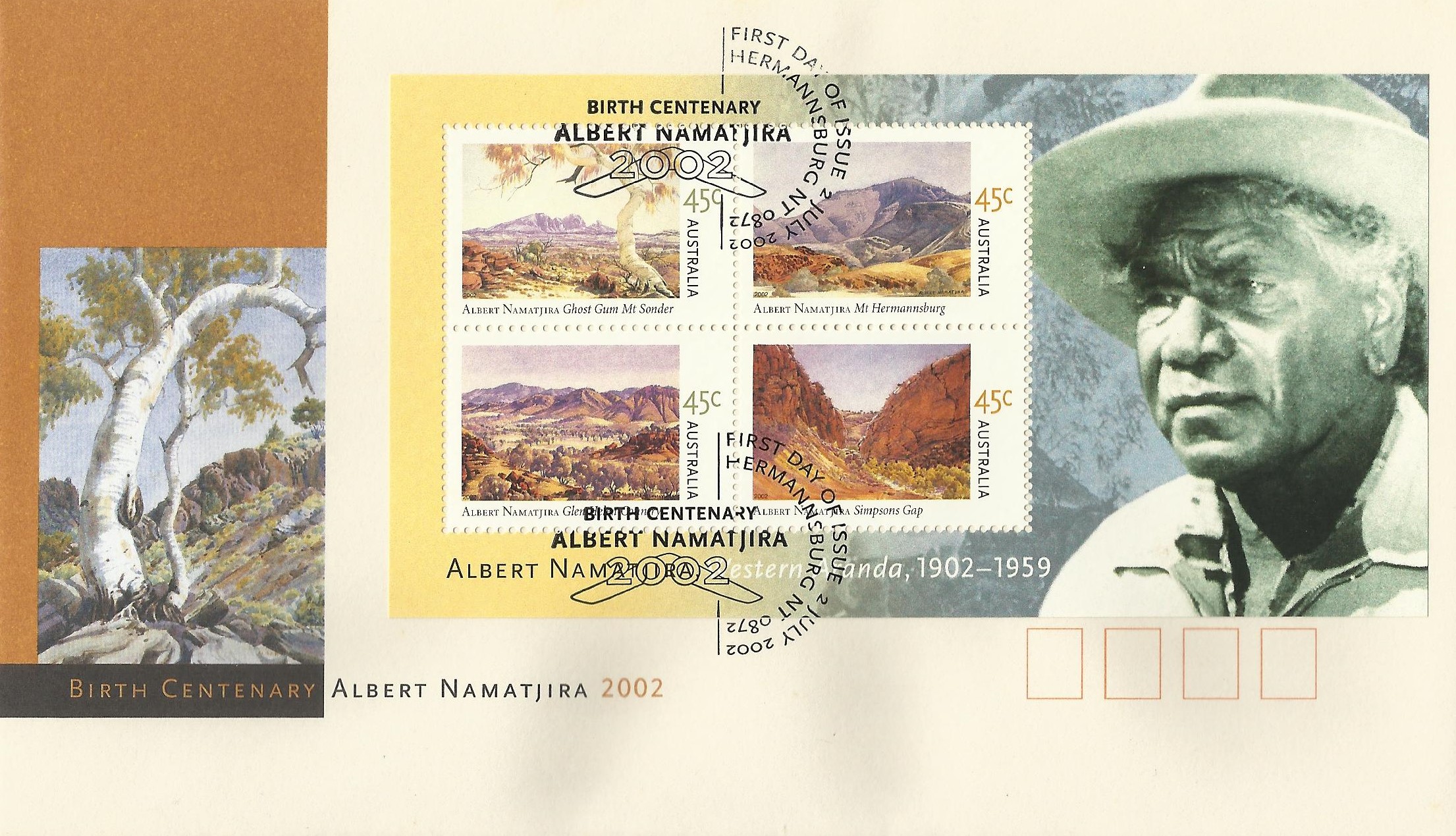 Albert Namatjira was the first Indigenous artist to paint and exhibit professionally in a Western style. During his lifetime he produced some two thousand pictures and also founded a school of painting. This stamp issue by Australia Post features four paintings by Albert Namatjira – Ghost Gum Mt Sonder, Mt Hermannsburg, Glen Helen Country and Simpsons Gap.