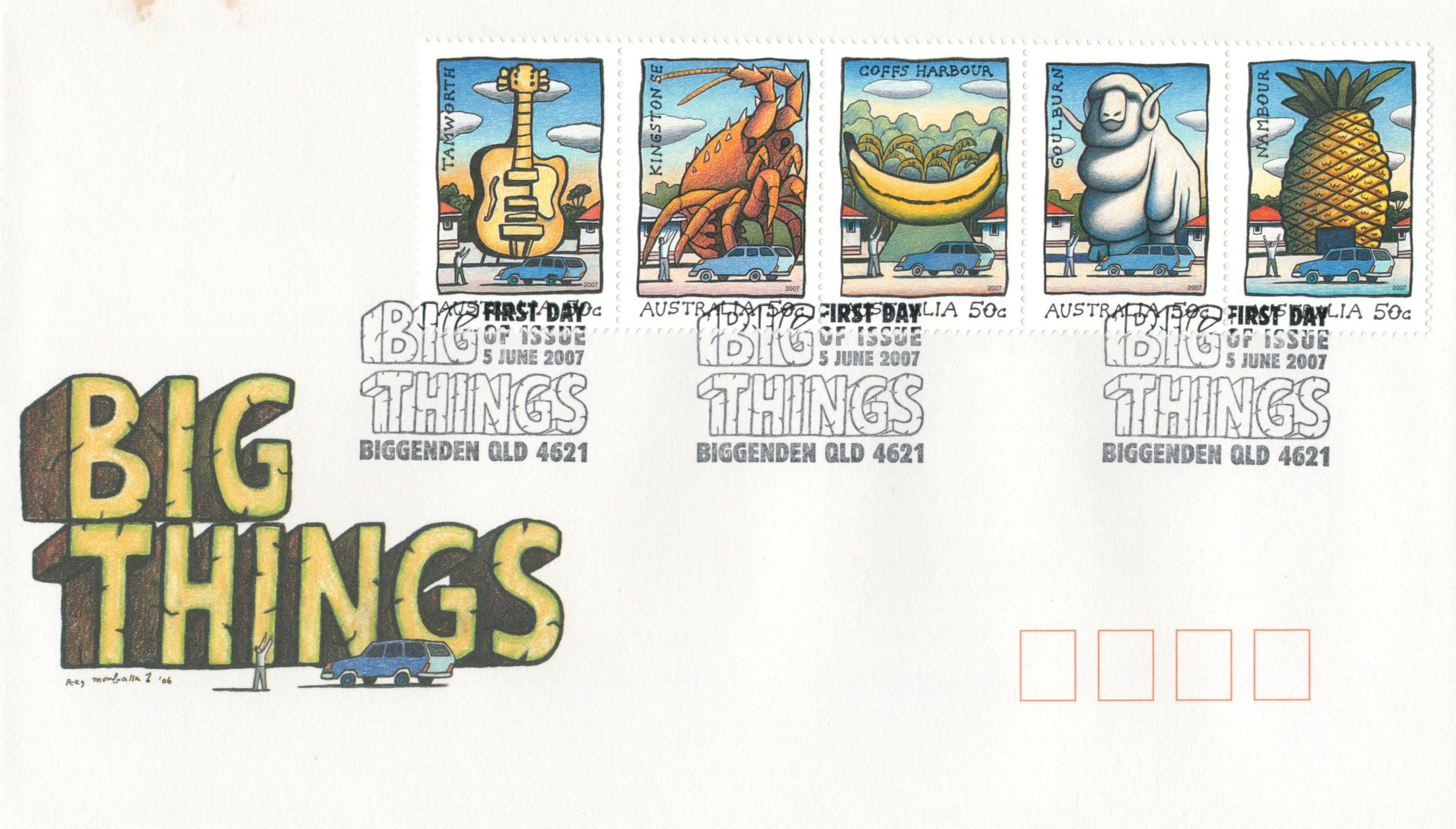 There are BIG THINGS all over Australia, from Big Bananas to Big Guitars to Big Barramundi. These BIG, usually bizarre and almost always on the roadside things are colloquially known as Australia's "Big Things". These giant, kitsch replicas scattered across the continent have traditionally functioned as advertising billboards, and have become iconic for many Australians. The Big Things featured in this stamp issue include the Big Golden Guitar in Tamworth NSW, the Big Lobster in Kingston SE SA, the Big Banana in Coffs Harbour NSW, the Big Merino in Goulburn NSW and the Big Pineapple in Nambour QLD.